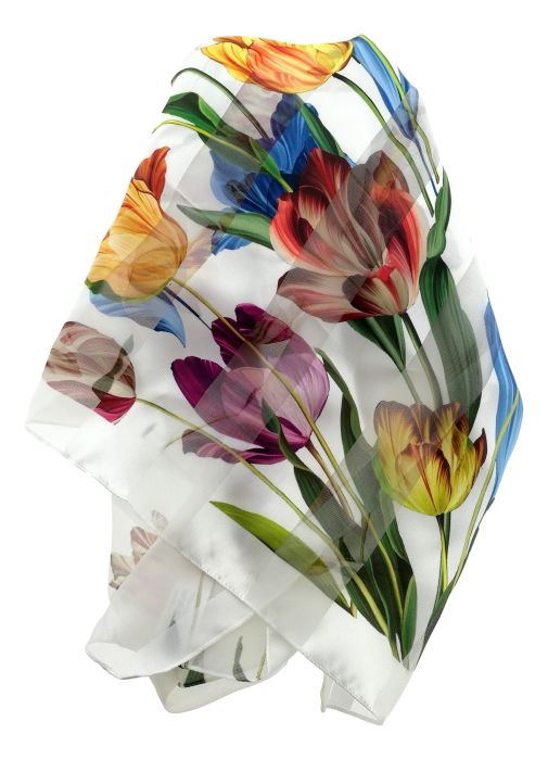 Mooi glanzende en zachte witte sjaal versierd met gekleurde tulpen.