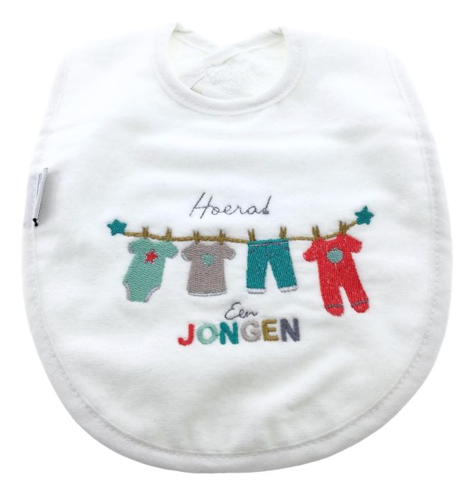 Dit lieve slabbetje heeft een gekleurde waslijn vol met kleding en de tekst "Hoera, een jongen" als versiering.