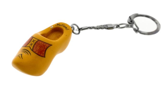 Houten sleutelhanger van 4 cm voorzien van een rijk versierd boerengeel houten klompje.