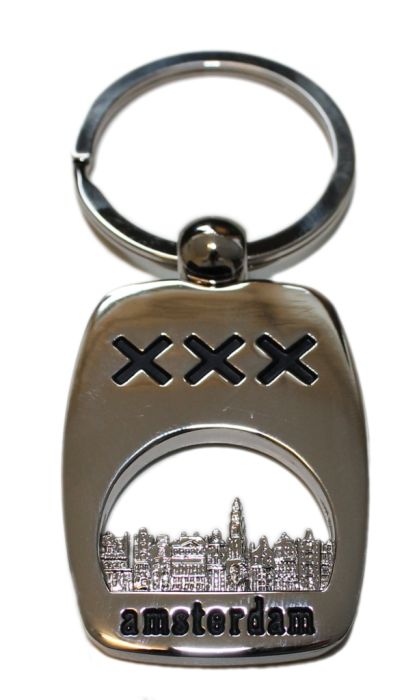 Stevige, mooi uitgevoerde metalen sleutelhanger versierd met Amsterdamse grachtenhuisjes.