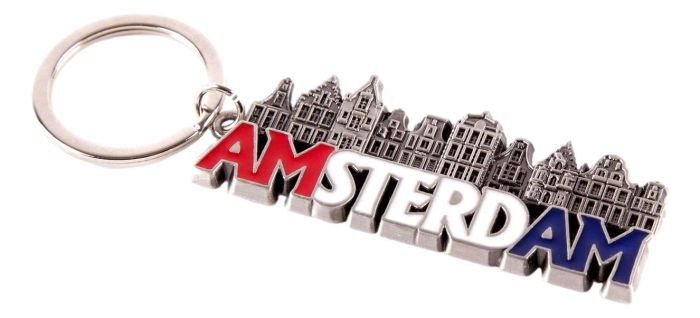 Metalen sleutelhanger met de tekst "Amsterdam" in rood/wit/blauw en de een rijdje met de bekende grachtenhuisjes.