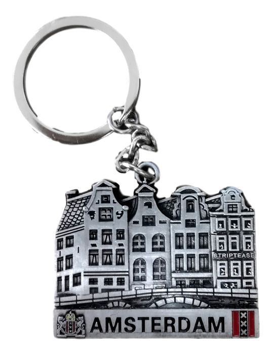 Leuke metalen sleutelhanger met een Amsterdam bedel. In tin kleur uitgevoerd en versierd met een aantal grachtenpanden.