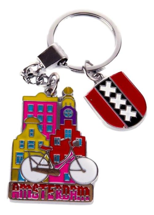 Een metalen sleutelhanger met een bedel met het wapen van Amsterdam en een tweede bedel met Amsterdamse grachtenhuisjes en een fiets.