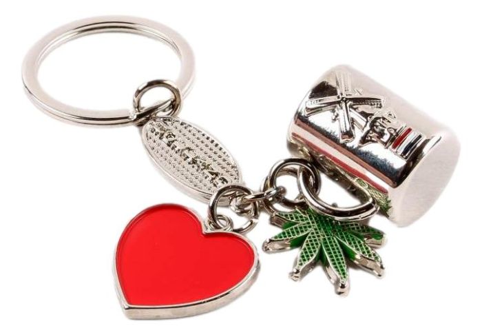 Deze metalen sleutelhanger heeft maar liefst 4 bedels. Een ovaalvormige bedel waarop het woord 'Holland' staat geschreven,een rood hartje , een groen wietblad bedel. En wat zou Holland zijn zonder de beroemde biercultuur?