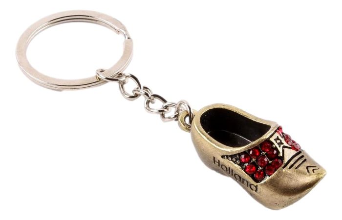 Deze charmante sleutelhanger is voorzien van een miniatuur klompje en is versierd met levendige rode steentjes.