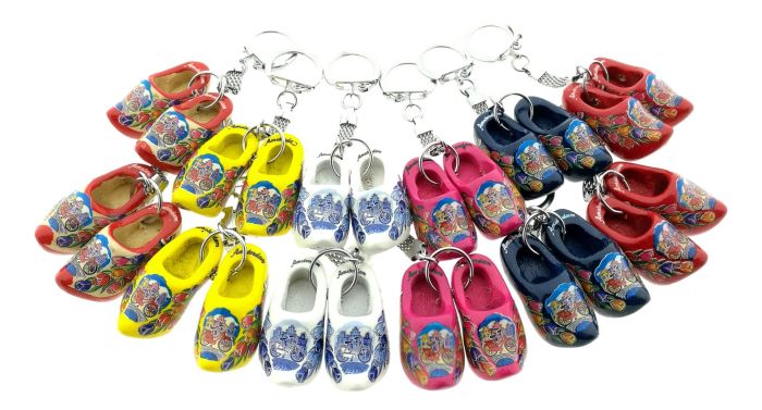 De set bevat 12 sleutelhangers, elk met een paar miniklompen in heldere en vrolijke kleuren, samen met een prachtige afbeelding van een Amsterdamse grachtenscene op de voorkant. Met zes verschillende kleuren om uit te kiezen, kun je mixen en matchen om bij jouw persoonlijke stijl te passen.