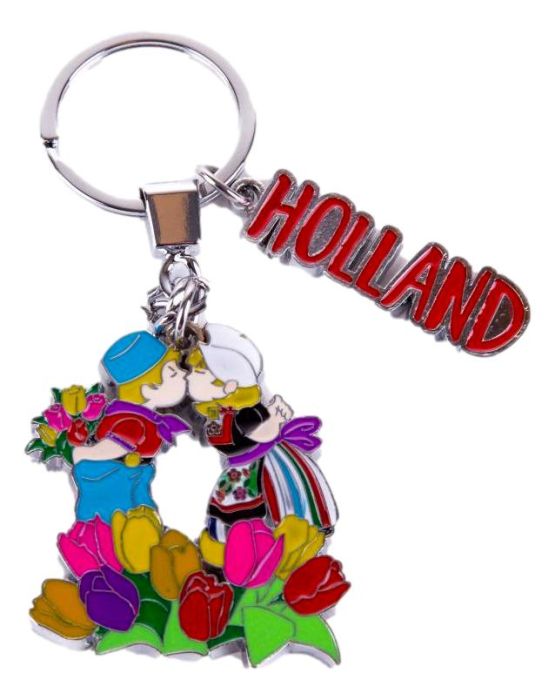 Leuke metalen sleutelhanger met twee kleurige bedels. Een is een kussend Hollands paar met bloemen, en de tweede is een Hollandse tekst.
