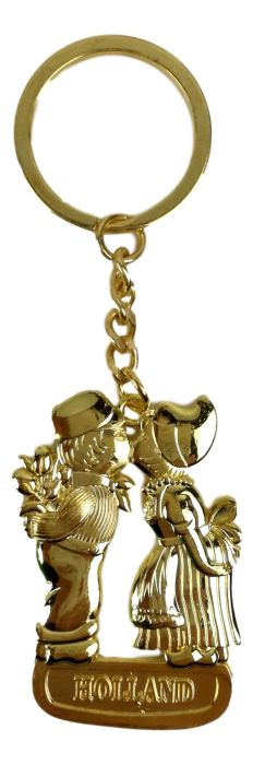 Deze glimmend goudkleurige sleutelhanger van het bekende Hollandse kussend paar is echte bling.