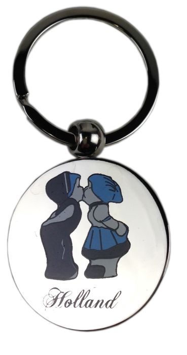 Sleutelhanger met lichte metaalkleurige hanger, met daarop het delftsblauwe kussende paartje. Diameter van de hanger is 4,8cm.