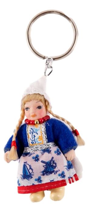 Sleutelhanger met een poppetje in een traditioneel blauw Hollands kostuum met witte hul en klompen.