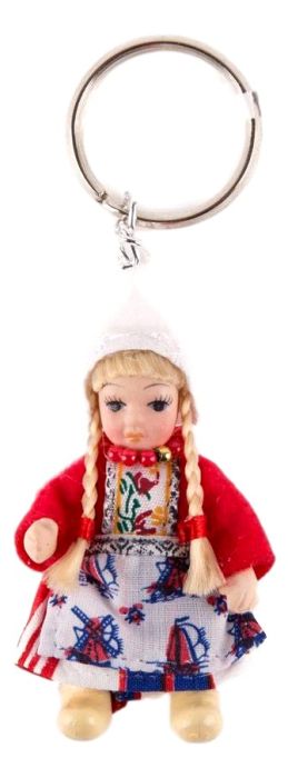 Sleutelhanger met een poppetje in een traditioneel rood Hollands kostuum met witte hul en klompen.
