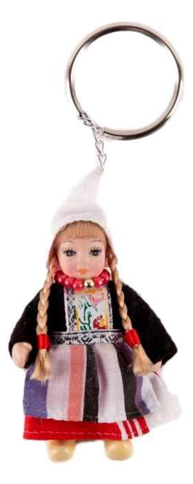 Sleutelhanger met een poppetje in een traditioneel zwart Hollands kostuum met witte hul en klompen.