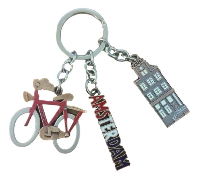 Leuke in tin kleur uitgevoerde metalen sleutelhanger met een drietal bedels: een rode fiets, "Amsterdam" en een grachtenhuis.