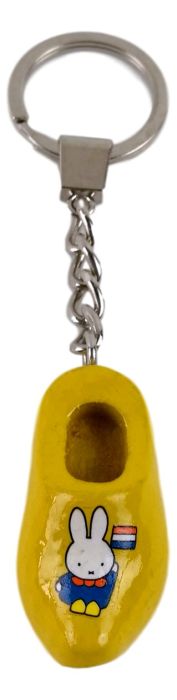 Op deze gele sleutelhanger staat Nijntje afgebeeld in een blauwe boerenkiel en heeft ze een Nederlands vlaggetje in haar hand.