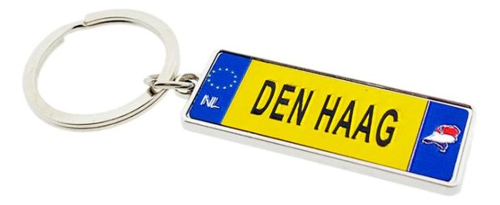 De sleutelhanger is gemaakt van metaal en heeft een blauw-geel auto nummerbord als decoratie. Het nummerbord is gedetailleerd met de tekst "Den Haag".