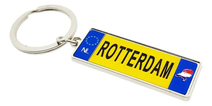De sleutelhanger is gemaakt van metaal en heeft een blauw-geel auto nummerbord als decoratie. Het nummerbord is gedetailleerd met de tekst "Rotterdam".