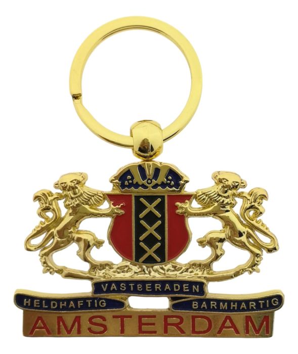 Goudkleurige sleutelhanger versierd met een groot wapen van Amsterdam in het goud/zwart en rood en de teksten "Vastberaden", "Heldhaftig", "Barmhartig". De hanger is gemaakt van metaal en is 6.5 cm breed en 5 cm hoog.