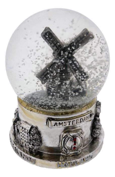 De sneeuwbol heeft een metaal uitstraling en heeft een molen die in het midden van de bol staat. Rondom de molen zijn typische Amsterdamse grachtenhuisjes te zien, wat de bol een authentieke en lokale uitstraling geeft.