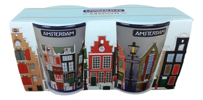 Geschenkverpakking met twee matglazen borrelglazen of shotglazen versierd met gekleurde Amsterdamse grachtendpanden in een bijpassende kartonnen verpakking.