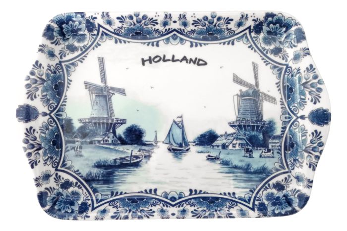 Kunststof dienblaadje Holland in Delfts blauw. Klein van stuk maar heel geschikt om een kopje thee op te presenteren. Afmeting is 21 x 14 cm.