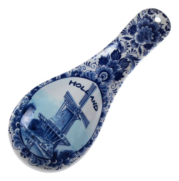 Deze kunststof lepelhouder is versierd met bloemen en de een Hollandse windmolen.
