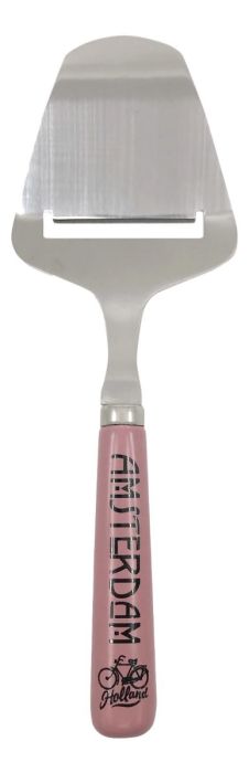 Stevige roze keramieken kaasschaaf versierd met de tekst "Amsterdam" in een mooi kartonnen doosje.