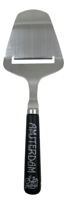 Stevige zwarte keramieken kaasschaaf versierd met de tekst "Amsterdam" in een mooi kartonnen doosje.