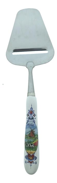 Mooie typisch Nederlandse kaasschaaf versierd met een Molen in landschap als afbeelding op het handvat.