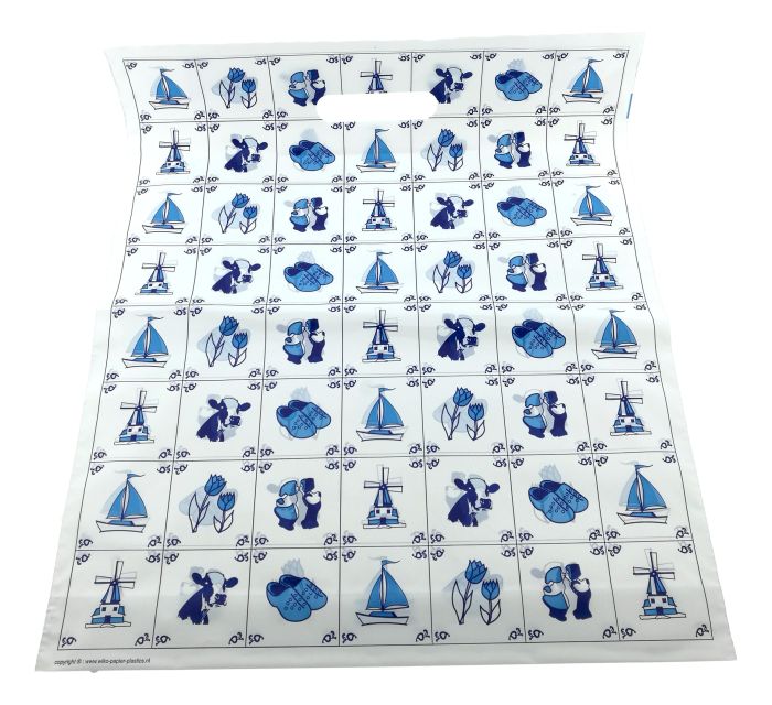 Deze witte plastic cadeau tas is versierd met tegels die de bekendste Nederlandse symbolen uitbeelden. Van kussend paar tot tulpen en windmolens.