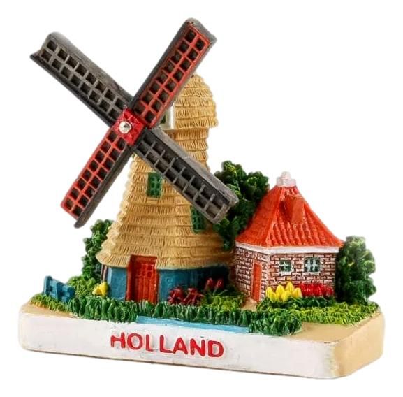 Dit kleine magneetje met typisch hollandse landschap is gemaakt van kunststeen. Het laat een poldermolen en een zaans huisje zien. De wieken kunnen draaien.