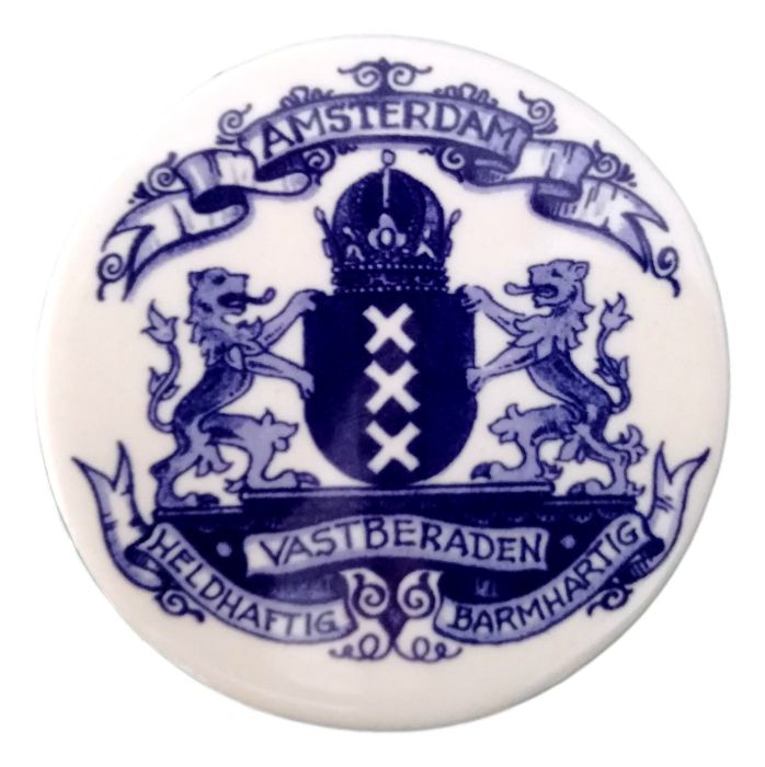 Ronde, Delft blauwe keramieke magneet met het wapen van Amsterdam.