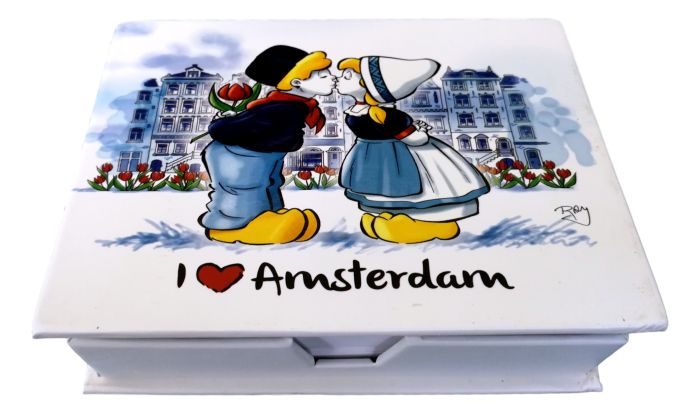 Doosje met witte notitieblaadjes blaadjes, versierd met een tekening van een boerenpaar voor de Amsterdamse grachten met de tekst "I ♥ Amsterdam".