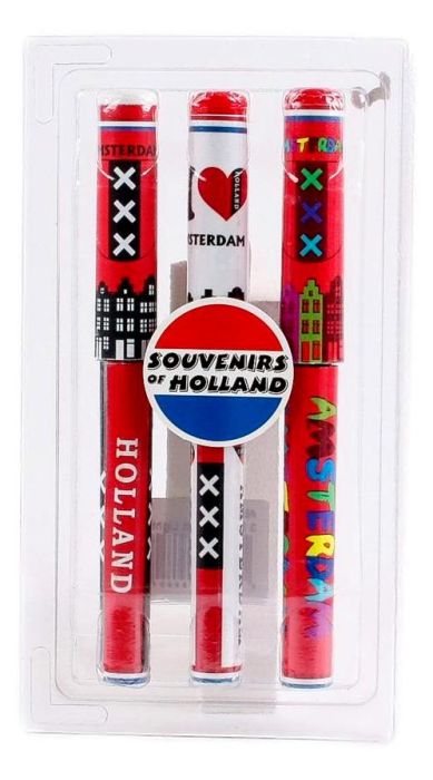 3 pennen in blister verpakking met verschillende afbeeldingen.