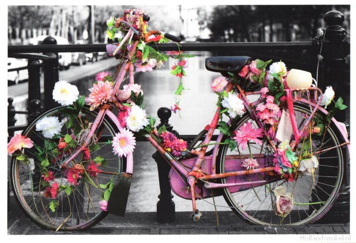 Deze stevige postkaart is bedrukt met een illustratie van een roze fiets versierd met bloemen op een zwart-wit achtergrond.