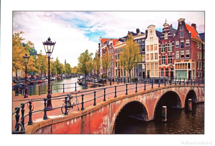 Deze stevige postkaart is bedrukt met een afbeelding van een Amsterdamse stadsgezicht. Hier is een brug over een Amsterdamse gracht te zien.