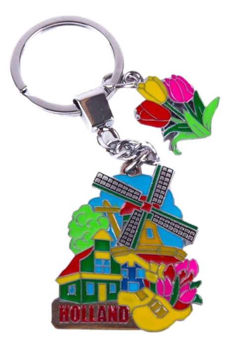 Deze sleutelhanger is een mooi souvenir van Nederland. Hij is gemaakt van verchroomd metaal en heeft twee bedels die typisch zijn voor Nederland: een molen landschap met klompen en tulpen, en een bosje tulpen.