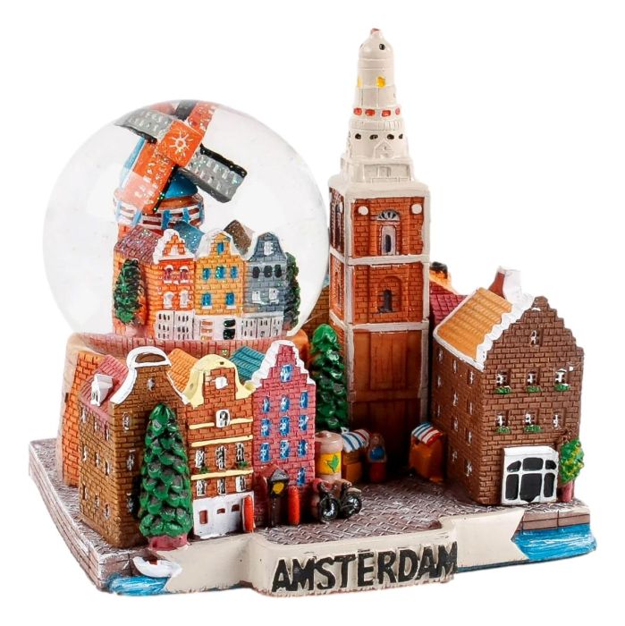 Deze prachtige waterbol is een geweldige manier om een vleugje Amsterdam aan je huis toe te voegen. Het toont een miniatuur stadspanorama van Amsterdam, inclusief een klokkentoren, een kerk en een gracht.