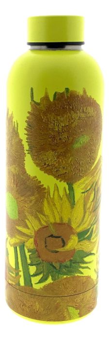 Dubbelwandige roestvrij stalen waterfles versierd met de Zonnebloemen van Vincent van Gogh. Wordt geleverd in een versierde stevige kartonnen doos.