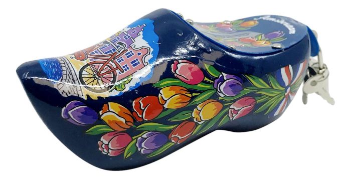 Deze blauwe houten spaarklomp met een bosje bloemen erop geschilderd is een leuk en origineel cadeau voor iedereen die van Nederlandse cultuur houdt. Vrolijk versierd met gekleurde tulpen, Amsterdamse grachten en een fiets.