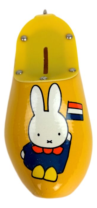 Leuke houten gele spaarklomp van Nijntje, versierd met Nijntje en een Nederlandse vlag op de voorkant en de tekst "Holland" op de zijkant.