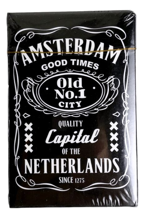 Doosje met 54 speelkaarten, voorzien van de tekst "Amsterdam Capital of the Netherlands".