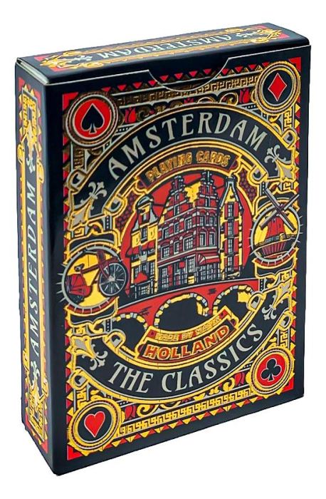 Geniet van een relaxed kaarspel met dit unieke setje speelkaarten. Het doosje is prachtig rood/goud gekleurd en gedecoreerd met een levendig Amsterdams thema.