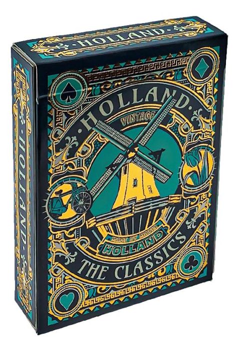 Geniet van een relaxed kaarspel met dit unieke setje speelkaarten. Het doosje is prachtig groen/goud gekleurd en gedecoreerd met een levendig Hollands thema.