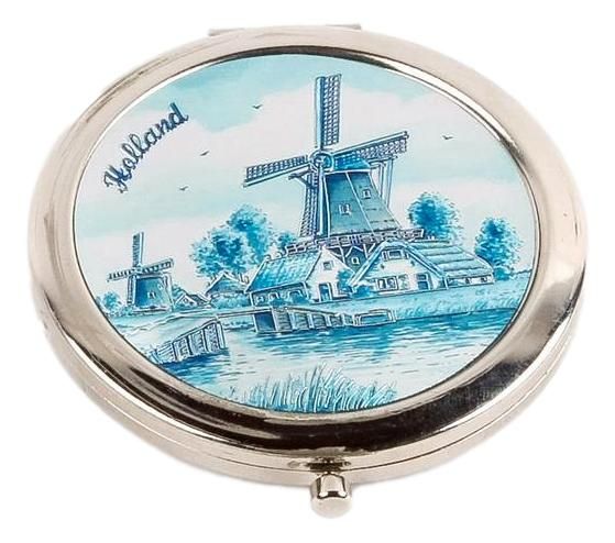 Dit elegante spiegeldoosje is een prachtig souvenir dat de iconische Nederlandse landschappen vastlegt in de klassieke Delfts blauwe stijl.