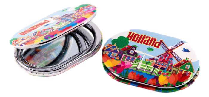 Dit levendige spiegeldoosje brengt de Hollandse charme tot leven in een explosie van vrolijke kleuren. Het ovale doosje toont een prachtige aquarel-achtig klassieke Hollandse landschap, compleet met windmolen, traditionele huisjes en zeilboot.