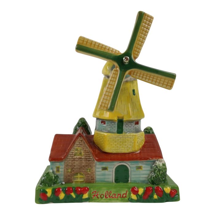 Vrolijk gekleurde stellingmolen boven op een huis. De molen is gemaakt van keramiek en wordt geleverd in een stevige doos.