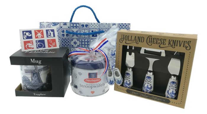 Leuk typischs Hollandse cadeaupakket om te geven als presentje. Lekkere stroopwafels in blik met een stevige koffiemok versierd met een Hollandse Windmolen, en een setje typisch Nederlandse kaasmessen.