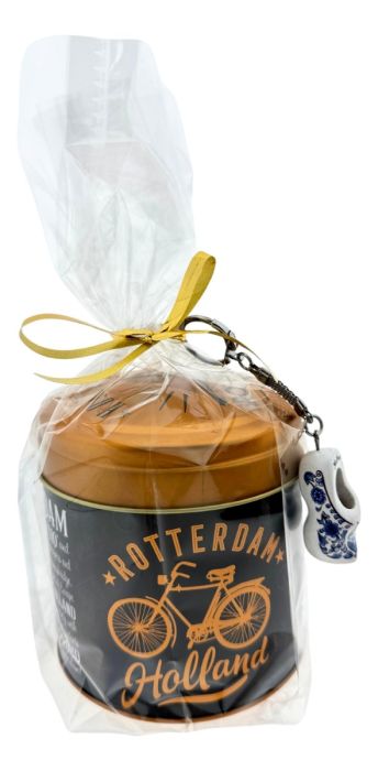 Mooi versierd sier stroopwafelblik verpakt in een cellofaan zakje dichtgebonden met een goudkleurig lint en een bijpassende klomp sleutelhanger. Het blikje heeft voorop de tekst Rotterdam, en aan de achterkant een beschrijving van deze fantastische stad.