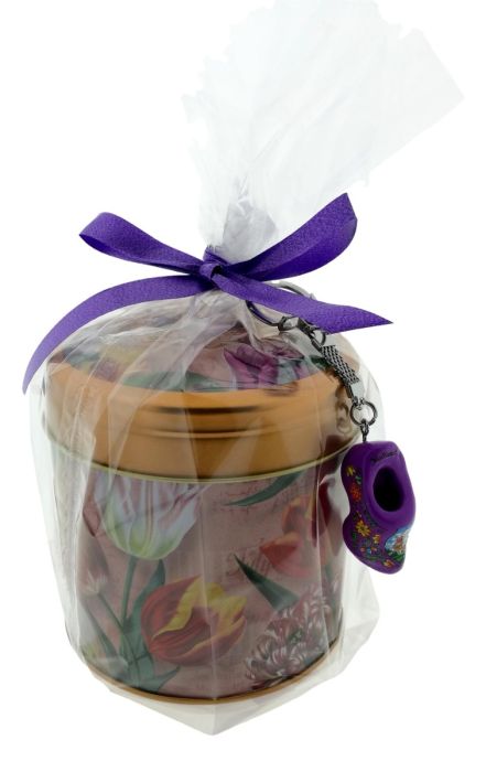 Mooi versierd sier stroopwafel blik gekleurde tulpen op een roze achtergrond in een cellofaanzakje en verbonden met een lintje en een sleutelhanger klompje.
