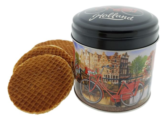 Mooi versierd sier stroopwafel blik met een rode fiets op een Amsterdamse brug.